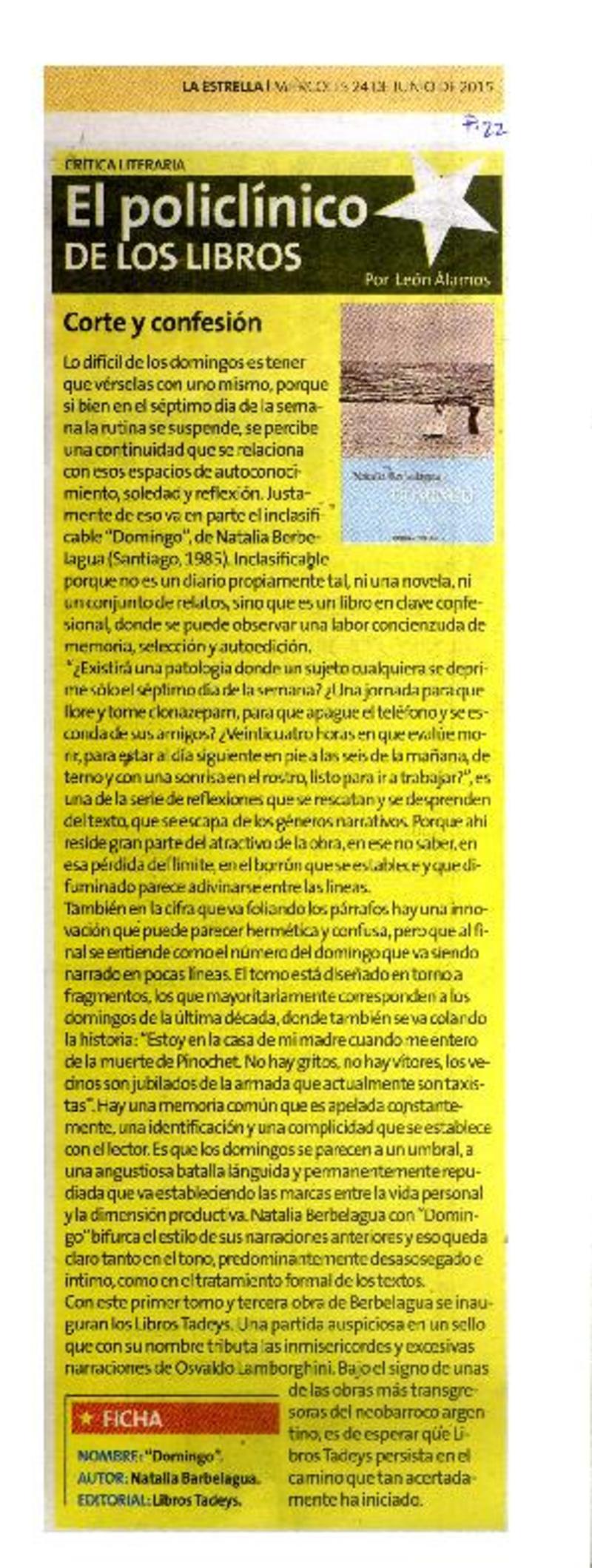 Corte y confesión [artículo] / León Álamos. La Estrella (Diario : Valparaíso, Chile)-- junio 24, 2015, página 22. .