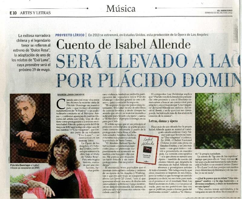 Cuento de Isabel Allende será llevado a la ópera por Plácido Domingo [artículo] / Maureen Lennon Zaninovic. El Mercurio (Diario : Santiago, Chile)-- jul. 22, 2012, p. E10-E11 (suplemento "Artes y Letras") .