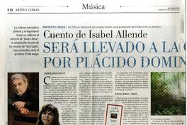 Cuento de Isabel Allende será llevado a la ópera por Plácido Domingo [artículo] Maureen Lennon Zaninovic.