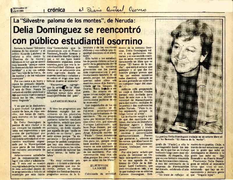 Delia Domínguez se reencontró con público estudiantil osornino. [artículo] El Diario Austral (Osorno, Chile)-- abr. 10, 1985, p. 6. retr. .