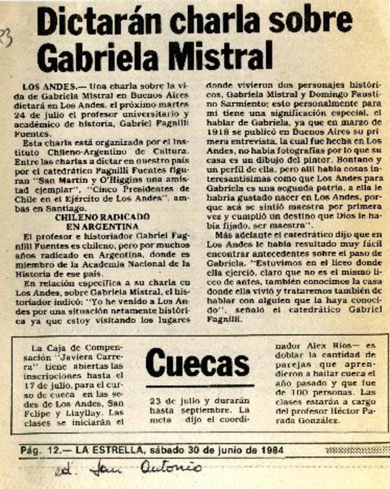 Dictarán charla sobre Gabriela Mistral [artículo] La Estrella (San Antonio, Chile)-- jun. 30, 1984, p. 12. .