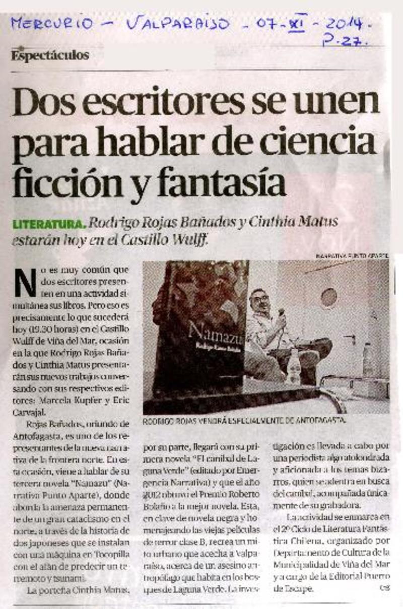 Dos escritores se unen para hablar de ciencia ficción y fantasía [artículo] / El Mercurio de Valparaíso (Diario : Chile) nov. 7, 2014, p. 27 .
