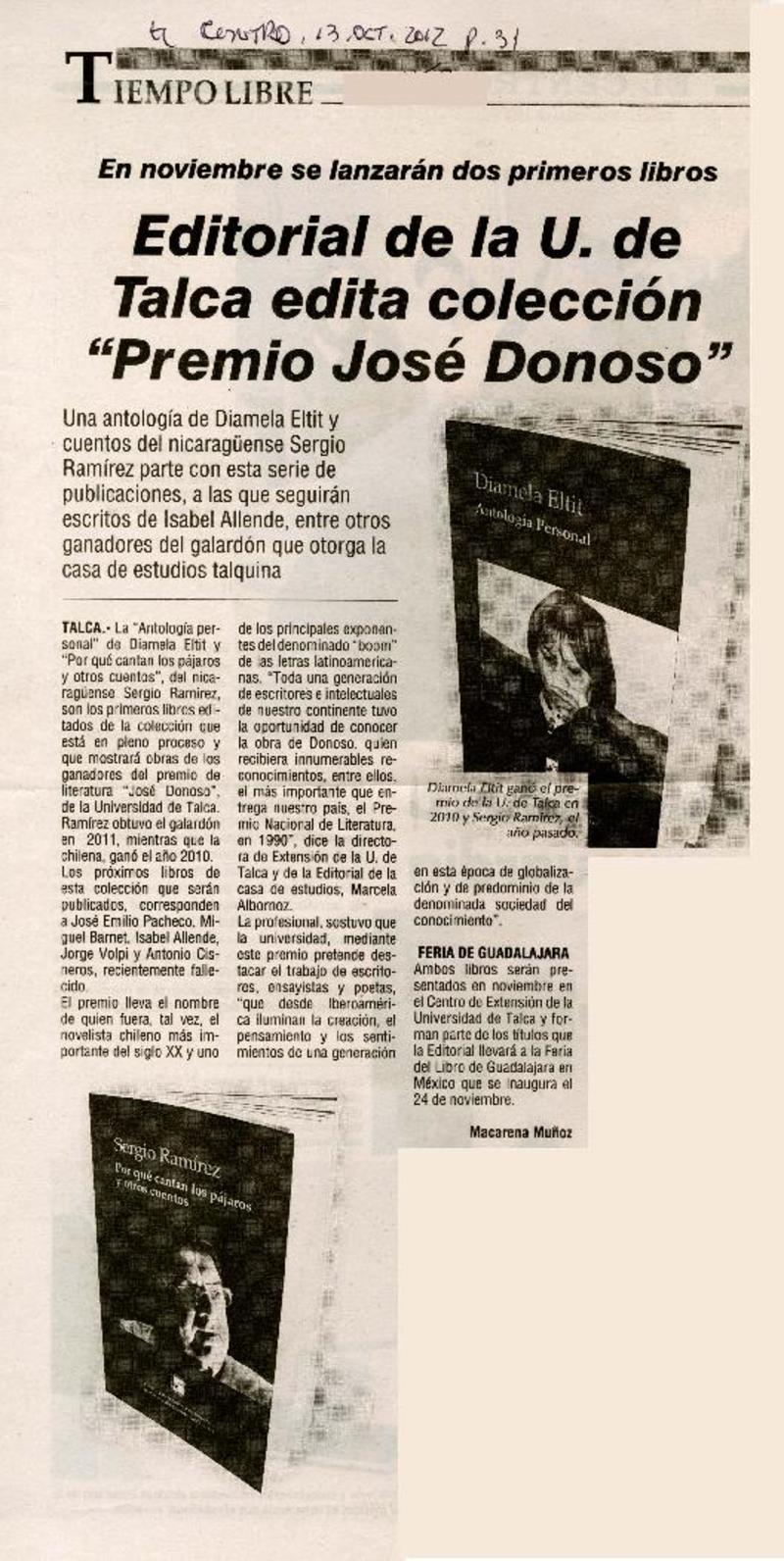 Editorial de la U. de Talca edita colección "Premio José Donoso" [artículo] / Macarena Muñoz El Centro (Diario : Talca, Chile)-- oct. 13, 2012, p. 31 .