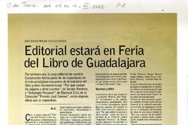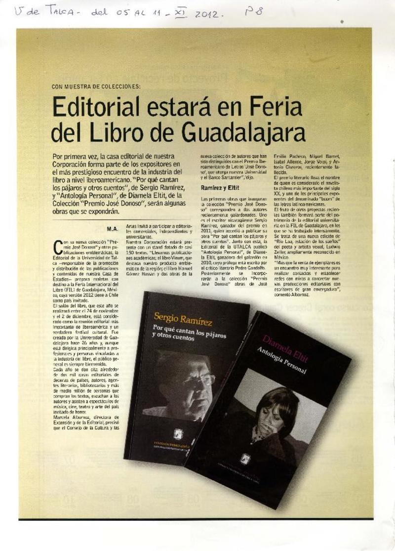 Editorial estará en Feria del libro de Guadalajara [artículo] / M.A. U de Talca (Revista : Santiago, Chile)-- nov. 5 al 11, 2012, p. 8. .