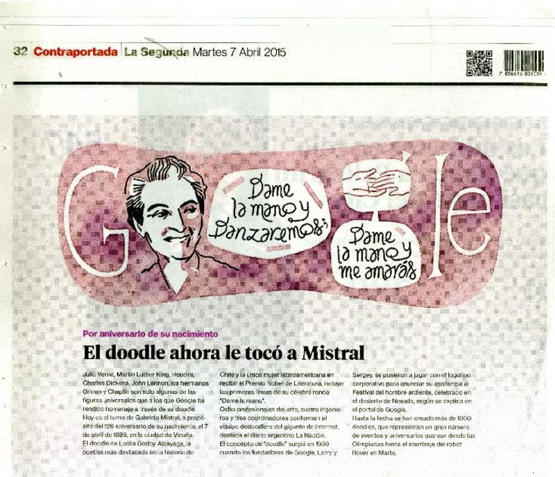 El doodle ahora le tocó a Mistral. [artículo] La Segunda (Diario : Santiago, Chile)-- abr. 7, 2015, p. 32. .