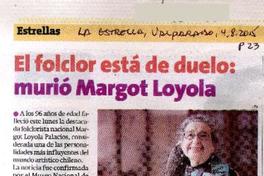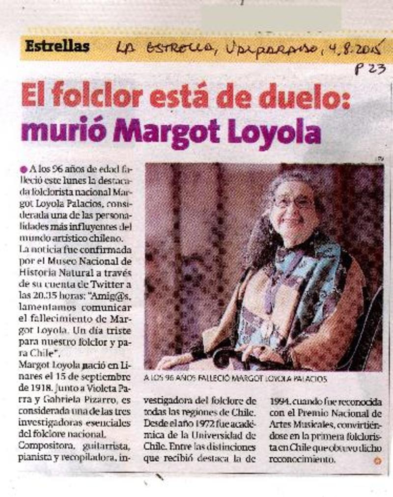 El folclor está de duelo: murió Margot Loyola. [artículo] La Estrella (Diario : Valparaíso, Chile)-- Agosto 4, 2015, página 23. .