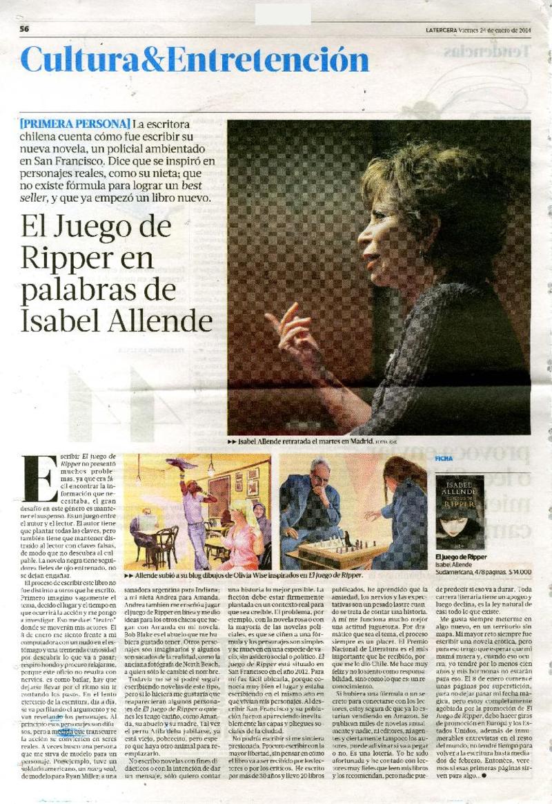 El Juego de Ripper en palabras de Isabel Allende [artículo] / La Tercera (Diario : Santiago, Chile)-- ene. 24, 2014, p. 56 .
