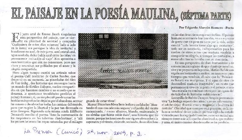 El paisaje en la poesía maulina, (séptima parte). [artículo] / Edgardo Alarcón Romero. La Prensa (Diario : Curicó, Chile)-- nov. 9, 2009, p. 3. .