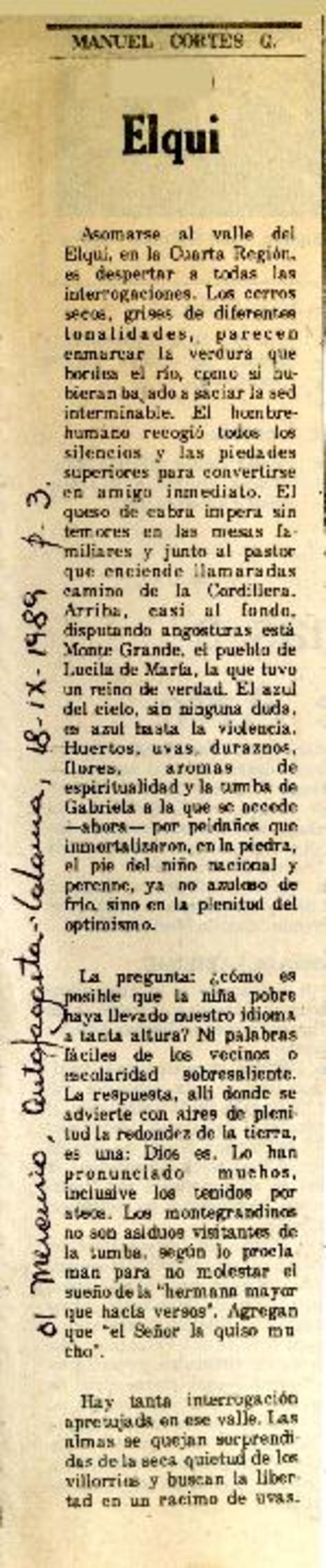 Elqui [artículo] / Manuel Cortés G. El Mercurio (Antofagasta, Chile)-- sept. 18, 1989, p. 3. .