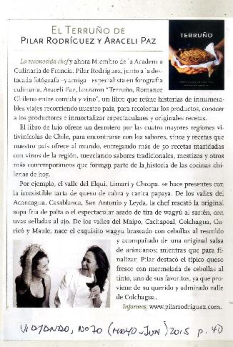 El terruño de Pilar Rodríguez y Araceli Paz. [artículo] Viajando (Revista : Santiago, Chile)-- no 70 (mayo-jun. 2015), p. 40. .