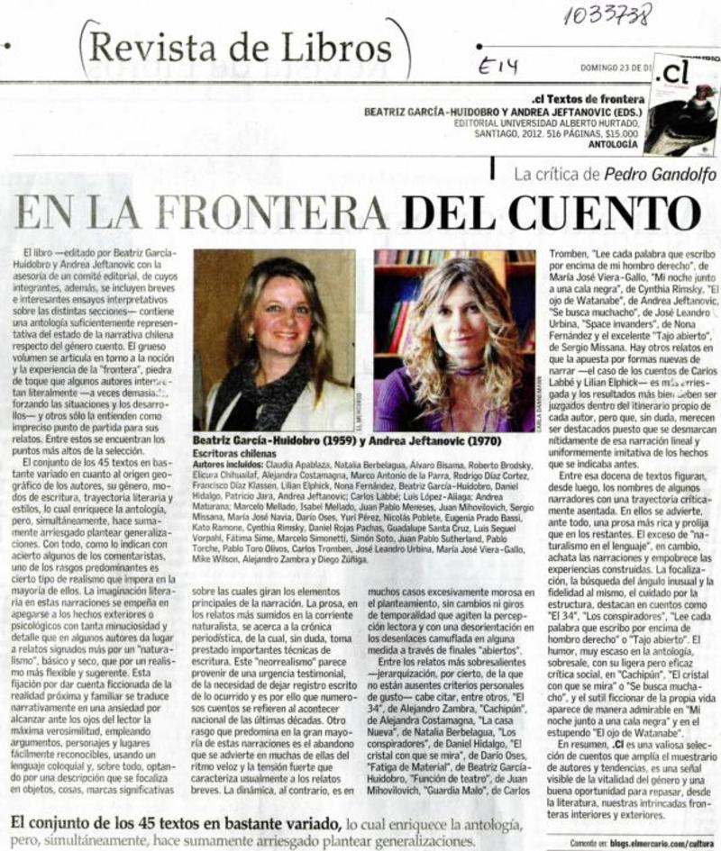 En la frontera del cuento [artículo]/ Pedro Gandolfo El Mercurio (Diario : Santiago, Chile)-- dic. 23, 2012, p. E14 (Revista de Libros) .