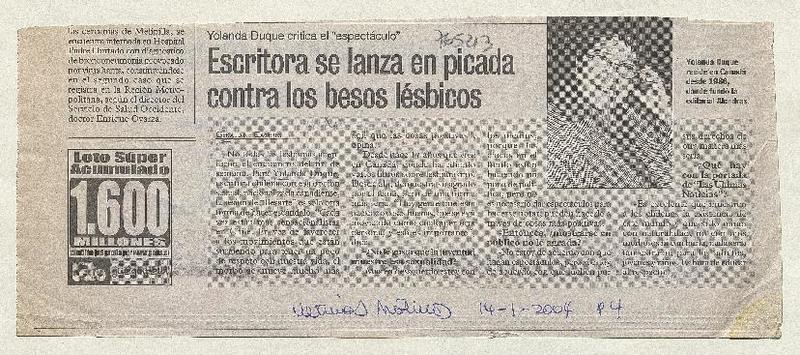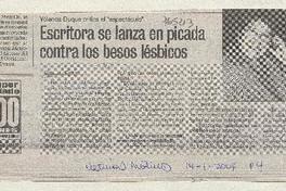 Escritora se lanza en picada contra los besos lésbicos [artículo] / Geraldine Cáceres. Las Últimas Noticias (Diario : Santiago, Chile)-- ene. 14, 2004, p. 4. retr. .