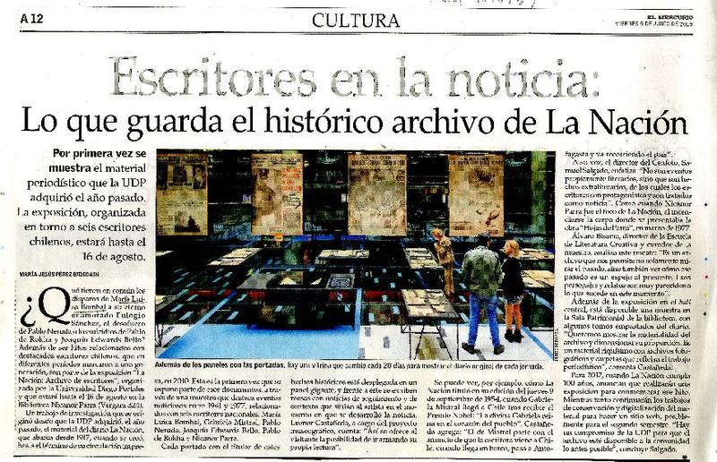 Escritores en la noticia: loque guarda el histórico archivo de La Nación [artículo] / María Jesús Pérez Bidegain. El Mercuio (Diario : Santiago, Chile)-- jun. 5, 2015, p. A12. .