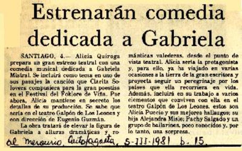 Estrenarán comedia dedicada a Gabriela [artículo] El Mercurio (Antofagasta, Chile)-- mar. 5, 1981, p. 15. .