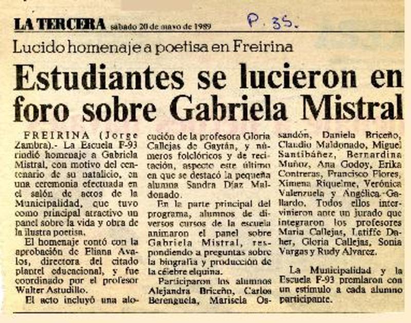 Estudiantes se lucieron en foro sobre Gabriela Mistral [artículo] La Tercera de la Hora (Diario : Santiago, Chile)-- mayo 20, 1989, p. 35. .