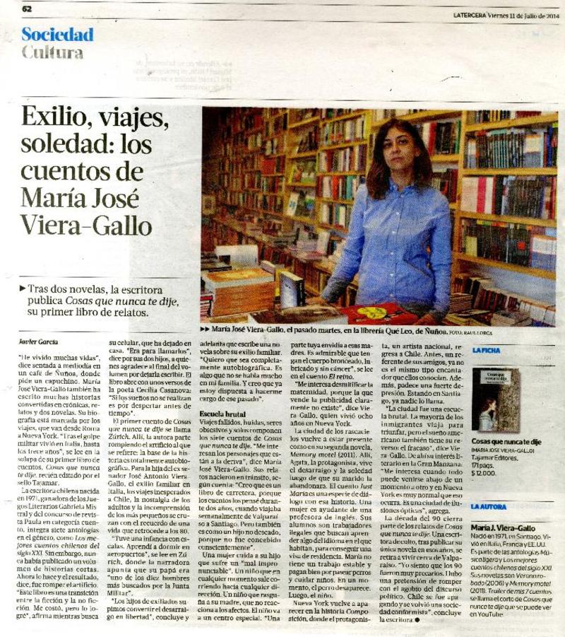 Exilio, viajes, soledad: los cuentos de María José Viera-Gallo [artículo] / Javier García La Tercera (Diario : Santiago, Chile)-- jul. 11, 2014, p. 62 .