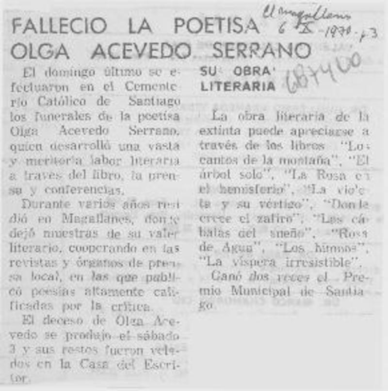Falleció la poetisa Olga Acevedo Serrano. [artículo] El Magallanes (Punta Arenas, Chile)-- oct. 6, 1970, p. 3. .