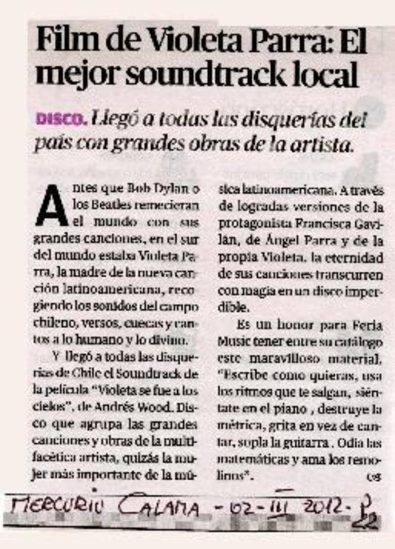 Film de Violeta Parra: el mejor soundtrack local. [artículo] El Mercurio (Diario : Calama, Chile)-- mar. 2, 2012, p. 22. .
