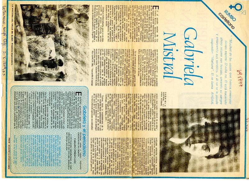Gabriela Mistral. [artículo] La Tercera (Diario : Santiago, Chile)-- oct. 2, 1979, p. 3. retr. .