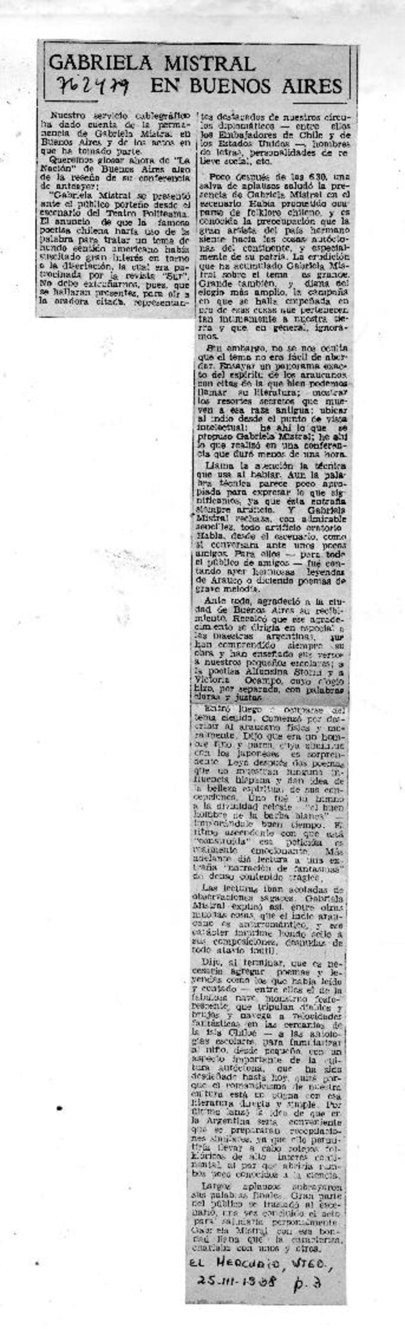 Gabriela Mistral en Buenos Aires. [artículo] El Mercurio (Santiago, Chile)-- mar. 25, 1938, p. 3. .
