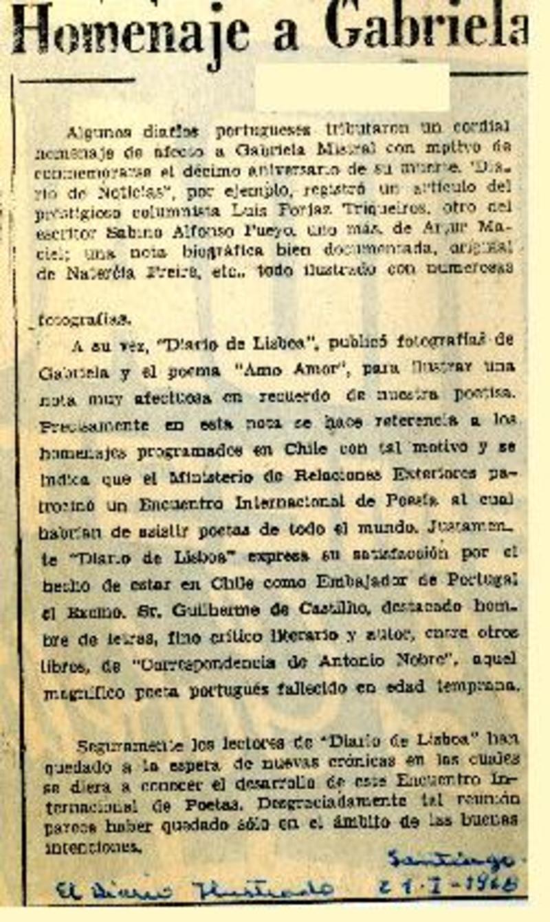 Homenaje a Gabriela. [artículo] El Diario Ilustrado (Santiago, Chile)-- ene. 2, 1968. .