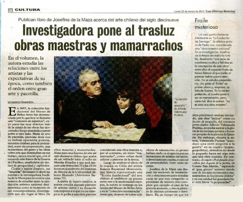 Investigadora pone al trasluz obras maestras y mamarrachos [artículo] / Leonardo Sanhueza Las Últimas Noticias (Diario : Santiago, Chile) marzo 23, 2015, p. 58 .