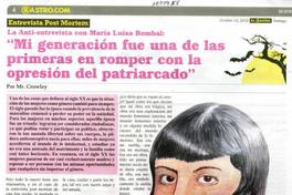 La Anti-entrevista con María Luisa Bombal: Mi generación fue una de las primeras en romper con la opresión del patriarcado [artículo] El Rastro (Diario : Santiago, Chile)-- oct. 12, 2012, p. 4 .