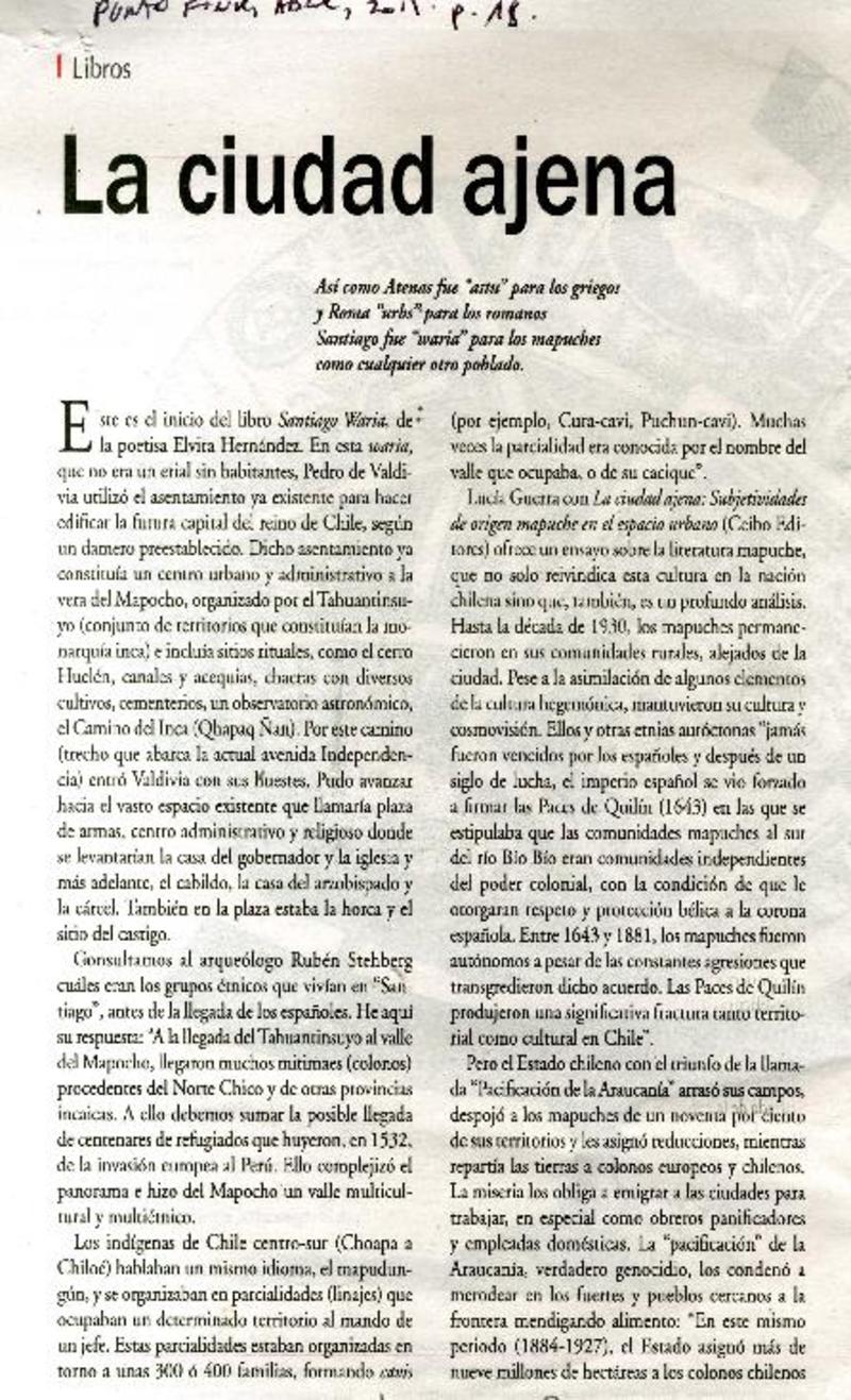 La ciudad ajena [artículo] / Virginia Vidal. Punto Final (Revista : Santiago, Chile)-- año 49, nº 826 (abr. 17 al 30, 2015), p. 18. .