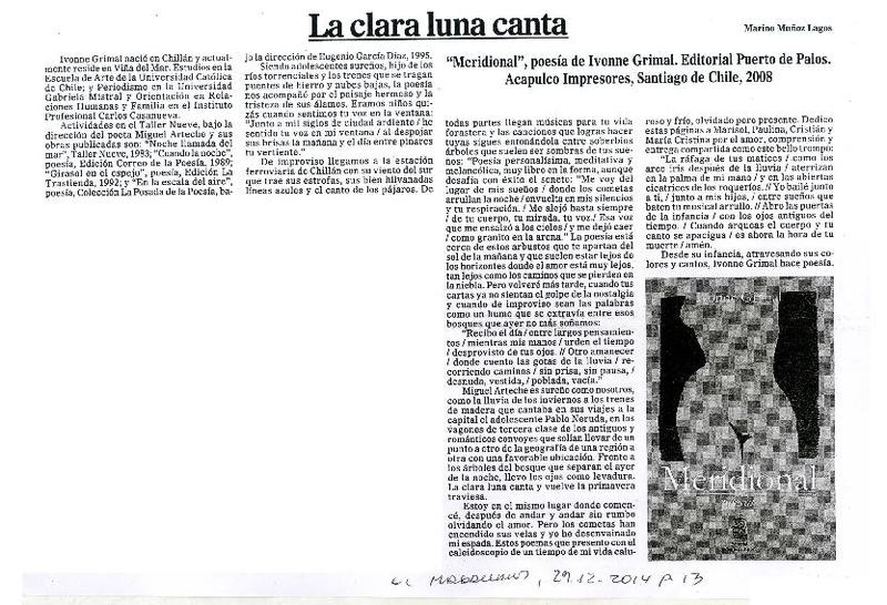 La clara luna canta [artículo] / Marino Muñoz Lagos El Magallanes (Diario : Punta Arenas, Chile) Dic. 12, 2014, p. 13 .