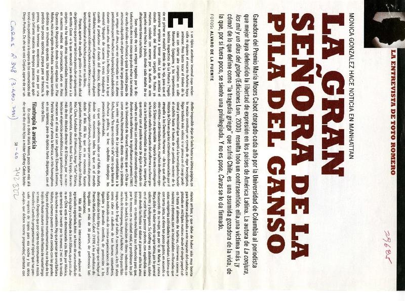 La gran señora de la Pila del Ganso [artículo] / Alvaro de la Fuente. Caras (Revista : Santiago, Chile)-- no. 348 (ago. 3, 2001) p. 58-60. .