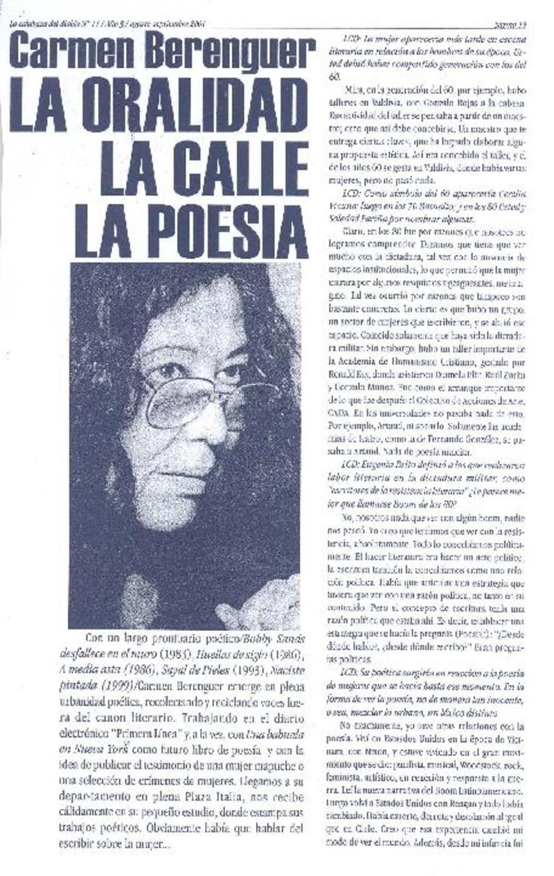 La oralidad, la calle, la poesía [entrevista] [artículo] / Luis Valenzuela P. La Calabaza del Diablo (Revista : Chile)-- no. 11 (ago. sept. 2001) p. 19-21 .
