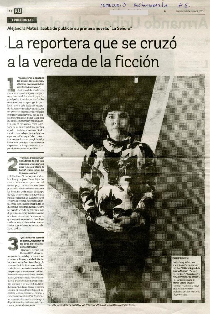 La reportera que se cruzó a la vereda de la ficción [entrevista] [artículo] El Mercurio (Diario : Antofagasta, Chile)-- jun. 28, 2015, p. 8. El Mercurio (Diario : Valparaíso, Chile)-- .