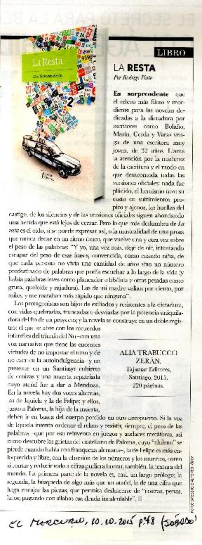 La resta [artículo] / Rodrigo Pinto. El Mercurio (Diario : Santiago , Chile)-- octubre 10, 2015, página 48 (suplemento "Sábado") .