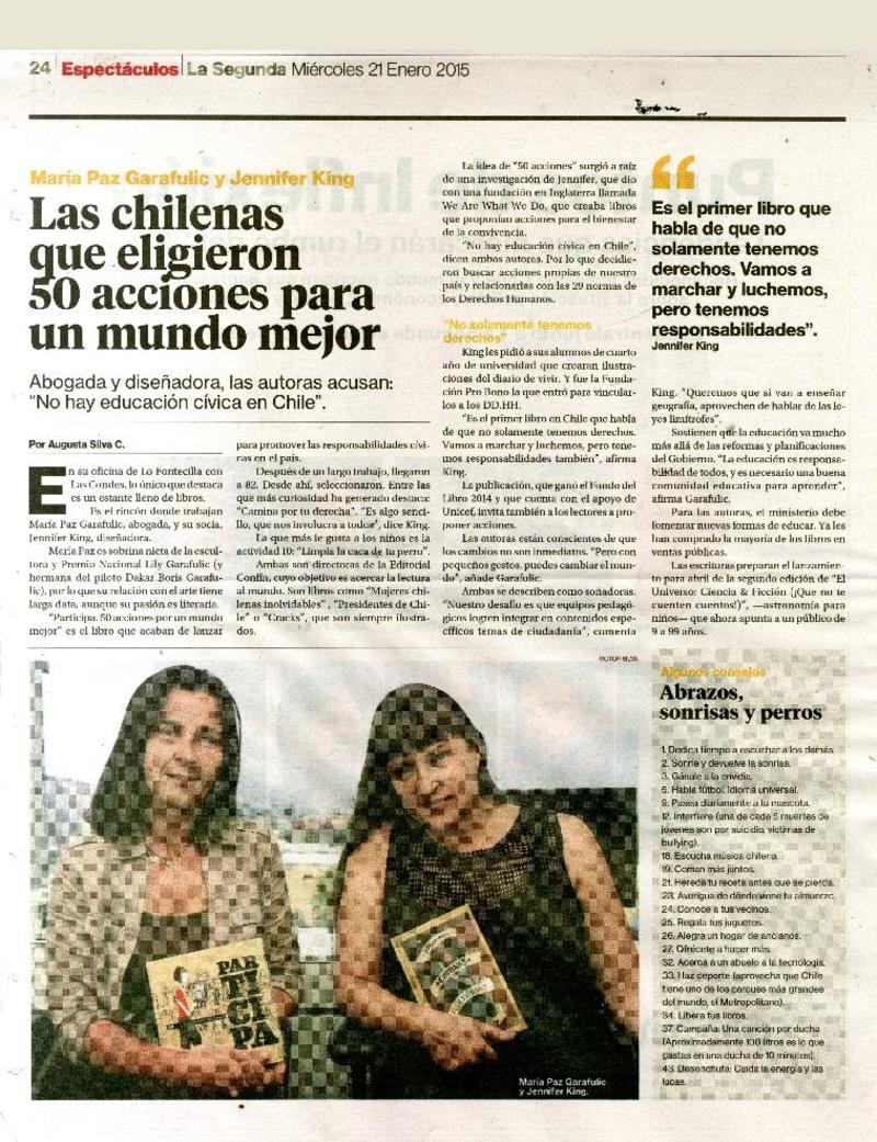 Las chilenas que eligieron 50 acciones para un mundo mejor [artículo] / Augusta Silva C. El Mercurio de Antofagasta (Diario : Antofagasta, Chile) diciembre 28, 2014, página 30 (Domingo) La Segunda (Diario : Santiago, Chile) enero 21, 2015, página 24 .