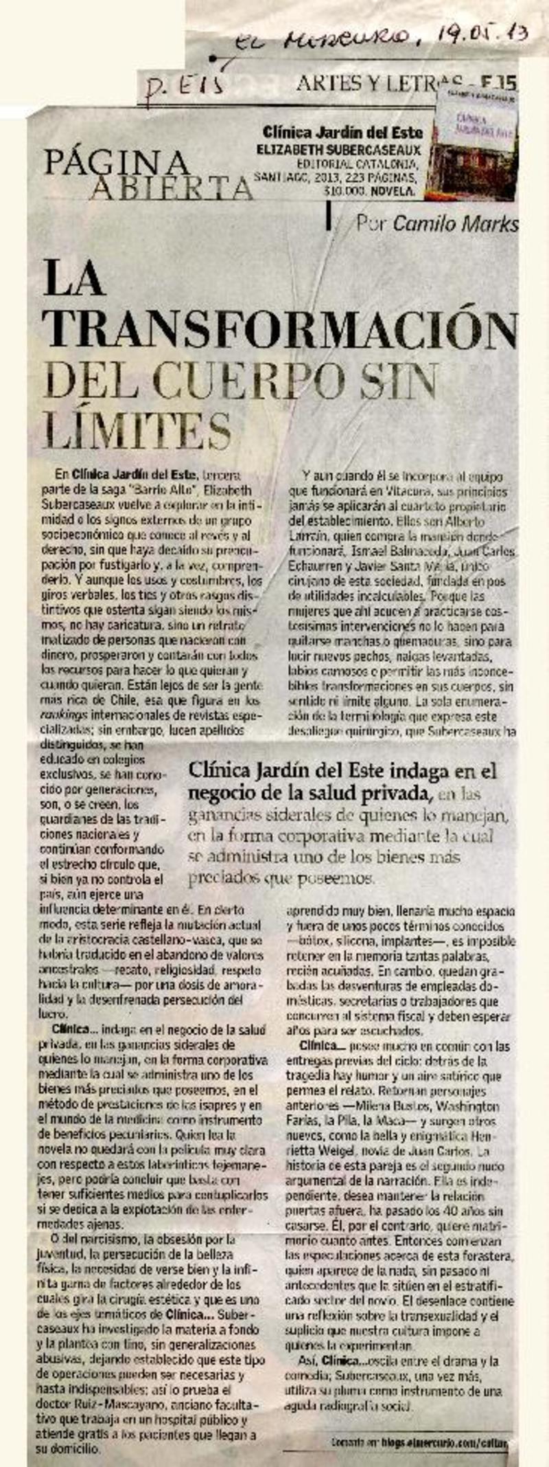 La transformación del cuerpo sin límites [artículo] / Camilo Marks. El Mercurio (Diario : Santiago, Chile)-- mayo 19, 2013, p. E15 (suplemento "Artes y letras") .