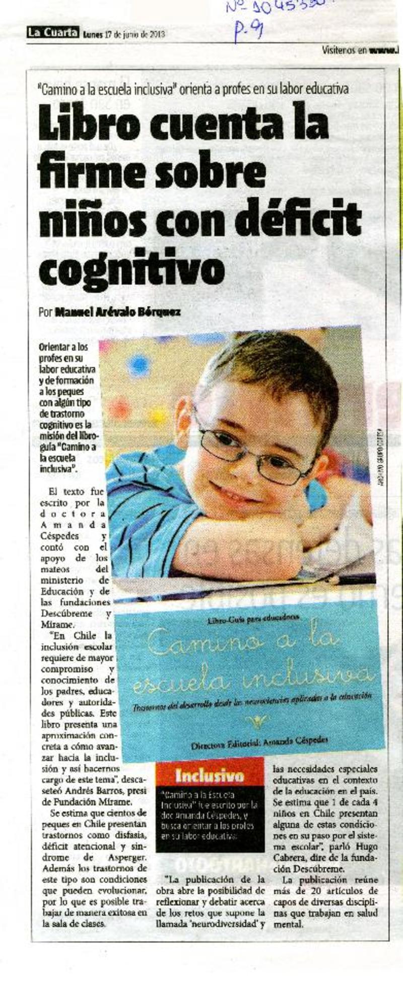 Libro cuenta la firme sobre niños con déficit cognitivo [artículo] / Manuel Arévalo Bórquez. La Cuarta (Diario: Santiago, Chile)-- jun. 17, 2013, p. 9 .