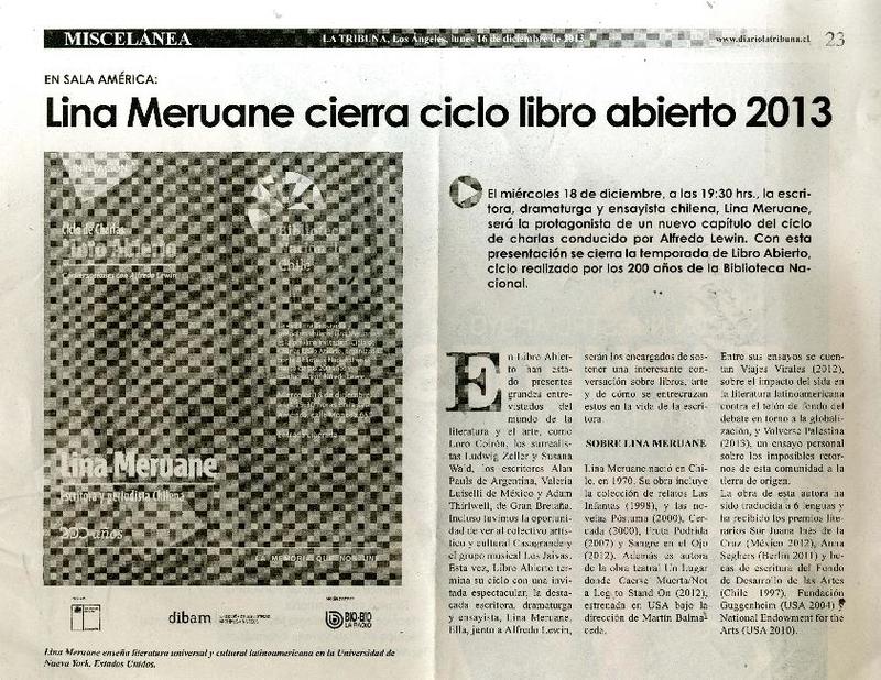 Lina Meruane cierra ciclo libro abierto 2013. [artículo] La Tribuna (Diario : Los Ángeles, Chile)-- dic. 16, 2013, p. 23. .