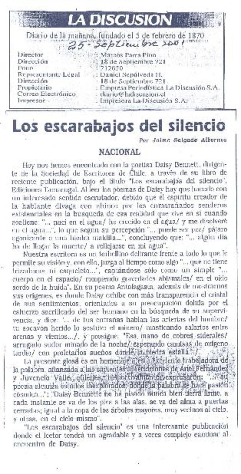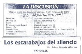 Los escarabajos del silencio [artículo] / Jaime Salgado Albornoz. La Discusión (diario : Chillán, Chile)-- sept. 25, 2001. .