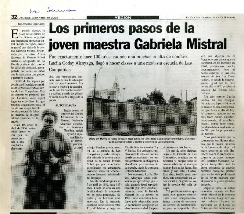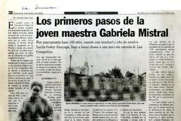 Los primeros pasos de la joven maestra Gabriela Mistral [artículo] / Armando Tapia Cortés. El Día (diario : La Serena, Chile)-- abr. 4, 2004, p. 32. retr. .