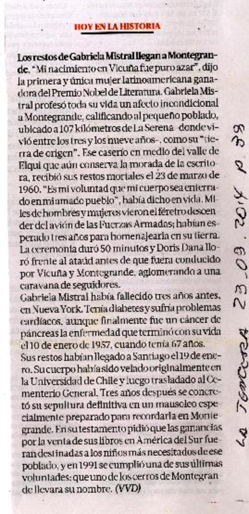 Los restos de Gabriela Mistral llegan a Montealegre [artículo] / VVD La Tercera (Diario : Santiago, Chile)-- mar. 23 2014, p. 38 .