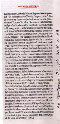 Los restos de Gabriela Mistral llegan a Montealegre [artículo] VVD