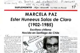 Marcela Paz. Ester Huneeus Salas de Claro (1902-1985) Escritora chilena. Nacida en Santiago de Chile [artículo] / El Fortin del Estrecho (Periódico : Punta Arenas, Chile)-- n° 112 (jun. 2013), p. 17 (Suplemento Hoja Amarilla La Vida en Poesía) .