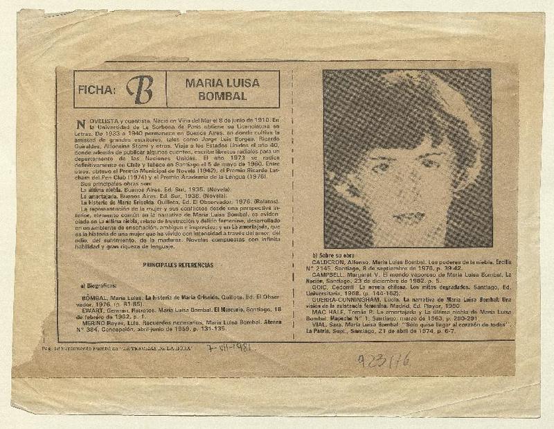 Sección Referencias Críticas. Bombal, María Luisa, 1981.