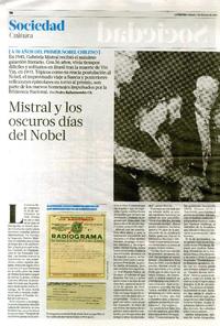 Mistral y los oscuros días del Nobel [artículo] / Pedro Bahamondes Ch. La Tercera (Diario : Santiago, Chile) febrero 7, 2015, p. 70-71 .