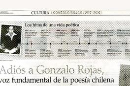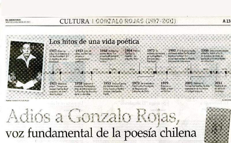 Adiós a Gonzalo Rojas, voz fundamental de la poesía chilena [artículo] / Constanza Rojas Valdés. El Mercurio (Diario : Santiago, Chile)-- abr. 26, 2011, p. A13-14 .