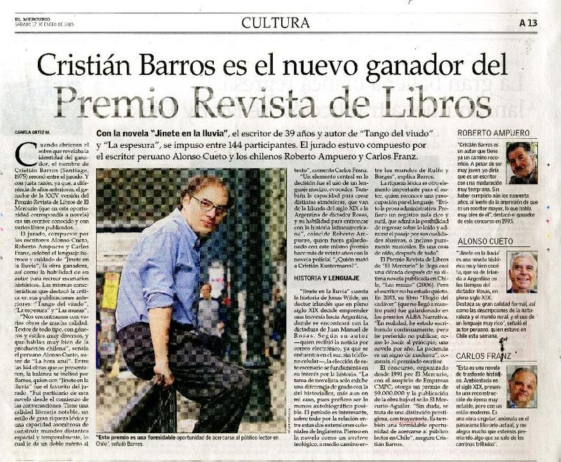 Cristián Barros es el nuevo ganador del Premio Revista de Libros [artículo] / Camila Ortiz M. El Mercurio (Diario : Santiago, Chile) enero 17, 2015, página A13 .