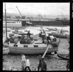 Borde costero de Puerto Montt en plena faena: lanchas, botes y un pequeño trasbordador cargado de víveres en sacos y canastos. Al fondo está el Tablestacado de fierro, construido a comienzos de 1930.