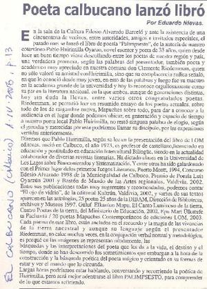 Poeta calbucano lanzó libro [artículo] / Eduardo Nievas. El Calbucano (Diario : Calbuco, Chile)-- abr. 1, 2006, p. 13. .