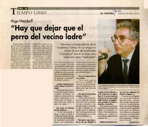 "Hay que dejar el perro del vecino ladre" (entrevista) [artículo] / Eduardo Bravo. El Centro (Diario : Talca, Chile)-- feb. 26, 2006, p. 18. .
