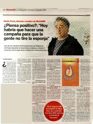 ¿Piensa positivo?: "Hoy habría que hacer una campaña para que la gente no tire la esponja" [entrevista] [artículo] / Pablo Tapia C. La Segunda (Diario : Santiago, Chile)-- Agosto 21, 2015, p. 40. .